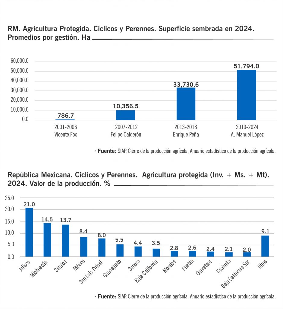 No obstante el dinamismo de la exportación de algunos productos agrícolas (aguacate, tomate rojo, pimiento y berries), solo 7.3 por ciento del valor de la producción agrícola se exportó en 2024. De lo producido por la AP, 2.6 por ciento se exportó y 5.45 por ciento se canalizó al mercado nacional; de lo producido a cielo abierto, 4.72 por ciento se exportó y 87.24 por ciento se distribuyó en el mercado nacional.