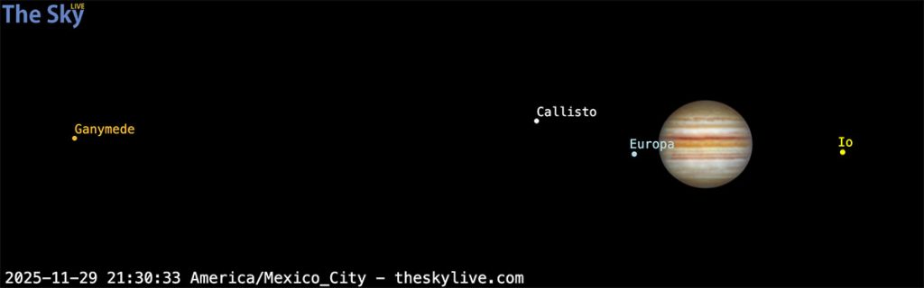 Por su parte, Júpiter aparecerá después de las 9 pm hacia la constelación de Géminis. Con telescopios de mediana apertura se podrán observar muy fácilmente los cuatro satélites galileanos: Io, Europa, Ganímedes y Calixto, tal como se muestra en la siguiente figura.
