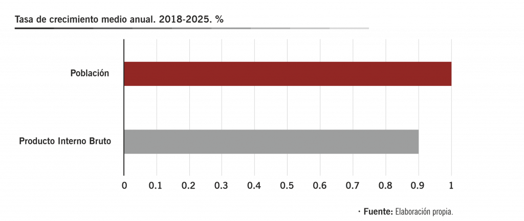 Según datos del Inegi (Estimación Oportuna del PIB, enero, 2026), 2025 cerró con un crecimiento de 0.7 por ciento respecto a 2024. Si ajustamos por el crecimiento de la población, el PIB per capita creció solo 0.1 por ciento. Esta situación no es novedosa. Desde 2018, año de inicio de la denominada Cuarta Transformación, la economía ha crecido a un ritmo promedio anual de 0.9 por ciento. Si se descuenta el crecimiento poblacional, cercano al 1.0 por ciento anual, el crecimiento del PIB per cápita se reduce a alrededor de 0.1 por ciento anual. Es decir, nos enfrentamos a un periodo de estancamiento económico secular que se viene arrastrando desde el inicio del modelo neoliberal en 1981.