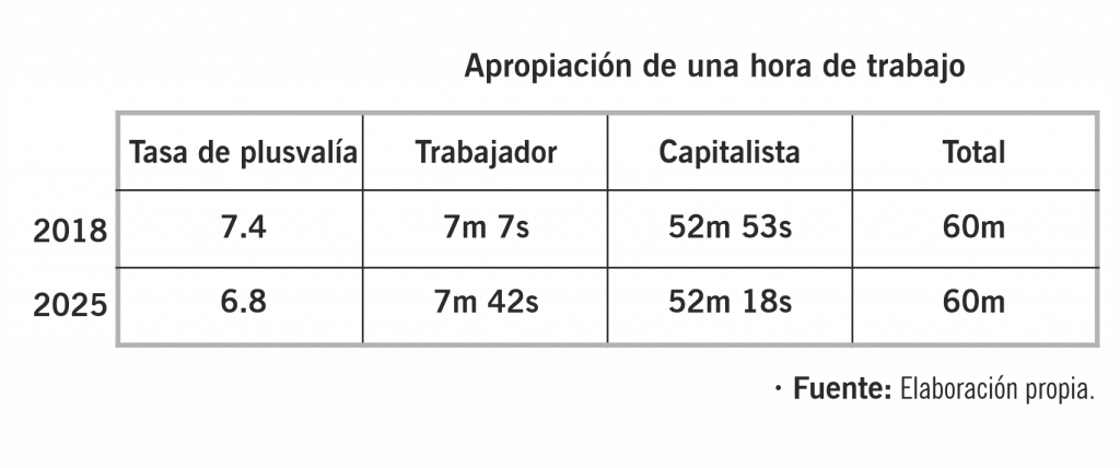 En torno a la distribución del ingreso, sin minimizar la reducción de la pobreza durante 2018 a 2024, nos encontramos con un alto nivel de la tasa de plusvalía. Esta, recordemos, expresa la relación entre los ingresos apropiados por el capital y aquellos que corresponden a la clase trabajadora. En 2018, esta tasa alcanzaba un nivel de 7.4, esto significa que, por cada hora de trabajo, el obrero se apropiaba de 7 minutos con 7 segundos, mientras que el capital, de los restantes 52 minutos con 53 segundos. Para 2025, una estimación rápida sitúa la tasa de plusvalía en 6.8; esto es, por cada hora trabajada, el obrero se apropia de 7 minutos con 42 segundos, mientras que el capital se apropia de 52 minutos con 18 segundos (aspectos metodológicos se pueden encontrar en “Canasta salarial y valor de la fuerza de trabajo. El caso de México”, en El Trimestre Económico, XC (1), 357, 2023, del suscrito). Aun con una pequeña reducción de la tasa de plusvalía, estamos en presencia de altos niveles de explotación económica por parte de la burguesía mexicana hacia la clase obrera.